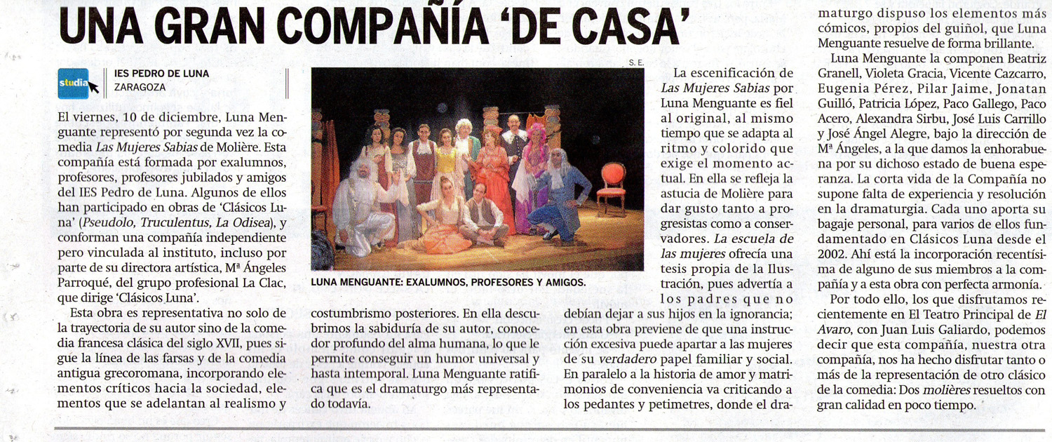 “El Periódico del Estudiante” de El Periódico de Aragón, ha publicado en su número 475 del 1 de febrero de 2011 un interesante artículo sobre la obra de Moliere “Las Mujeres Sabias”, en el que se aportan consideraciones sobre algunas de las características del teatro del autor francés, y el contexto histórico. El periodista se alegra de la coincidencia en el tiempo de las representaciones de El Avaro en el Teatro Principal, por una compañía profesional y de estas mujeres por la Compañía Luna Menguante muy vinculada a nuestro instituto y dirigida por “Teatro La Clac”.