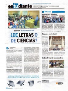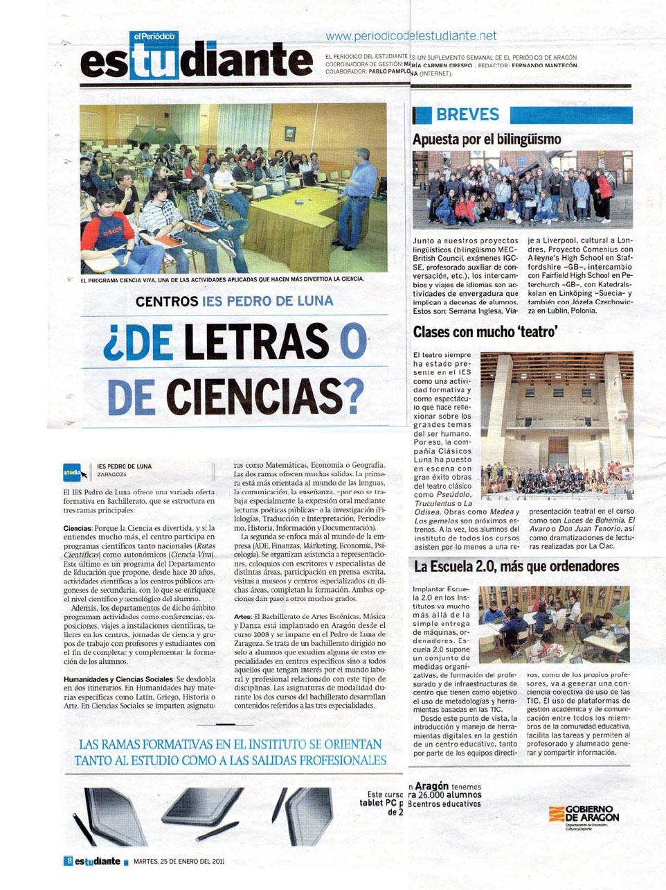 “El Periódico del Estudiante” de El Periódico de Aragón, ha publicado en su número 474 del 25 de enero de 2011 información sobre diversos aspectos de la vida y la oferta educativa del IES Pedro de Luna. Nos dedica una página completa, en la que el artículo principal describe algunas características de los estudios de bachillerato. Tres artículos más breves explican la importancia de la enseñanza bilingüe, la dimensión educativa del teatro, y el trabajo que el IES Pedro de Luna lleva a cabo, en el marco del Programa Escuela 2.0, para integrar las nuevas tecnologías en la vida cotidiana de nuestro centro escolar.