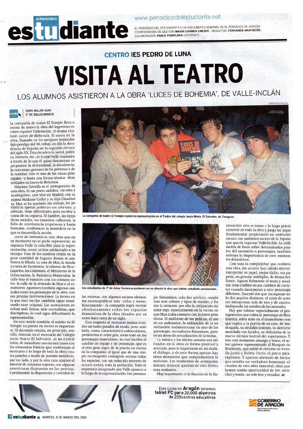 “El Periódico del Estudiante” de El Periódico de Aragón, deja constancia de esta puesta en escena, en su número 480 del 8 de marzo de 2011, con una crónica escrita por la alumna del IES Pedro de Luna Sara Millán Guiu, después de asistir a la representación junto a los compañeros y profesores de “Artes Escénicas” y “Literatura Universal” de 2º de bachillerato.