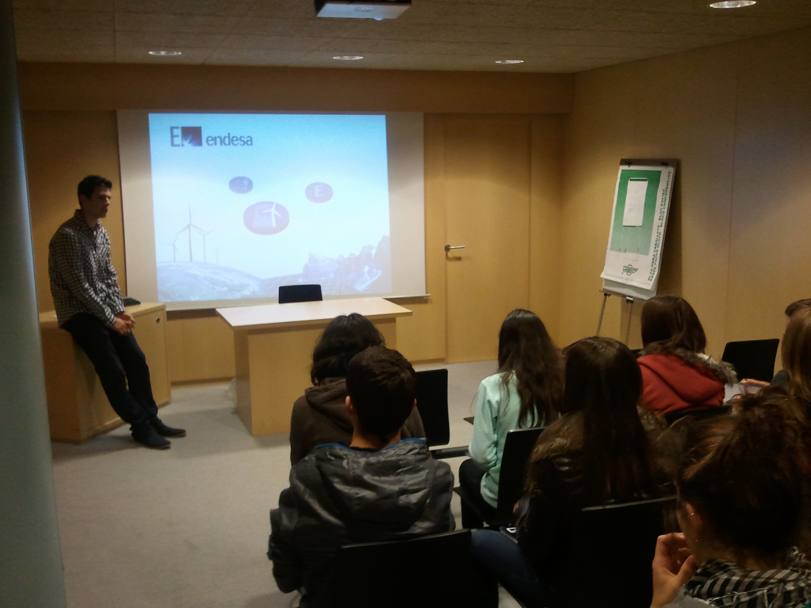 Los alumnos de tercero de ESO del IES Pedro de Luna están visitando el edificio de Endesa de la calle San Miguel a lo largo de los meses de noviembre y diciembre, en el marco de la asignatura de Tecnología. La actividad consiste en una charla, con diapositivas proyectadas, donde un ingeniero químico de la empresa les cuenta a los estudiantes la importancia del ahorro energético y de las energías renovables. Se ven las distintas centrales eléctricas que hay así como una introducción a la instalación eléctrica en una vivienda. Su duración es de una hora, más el tiempo dedicado a todas las preguntas que hacen los alumnos, los cuales posteriormente deberán realizar una presentación, sobre distintas energías, en clase. Hay algún dato curioso que les llama más la atención, rompiendo la monotonía de tanta información concentrada en tan poco tiempo, como que un aerogenerador (quitando el mástil que lo ancla al suelo) puede tener el tamaño de un autobús o que en las centrales hidroeléctricas se pueda bombear el agua de vuelta al embalse durante la noche.