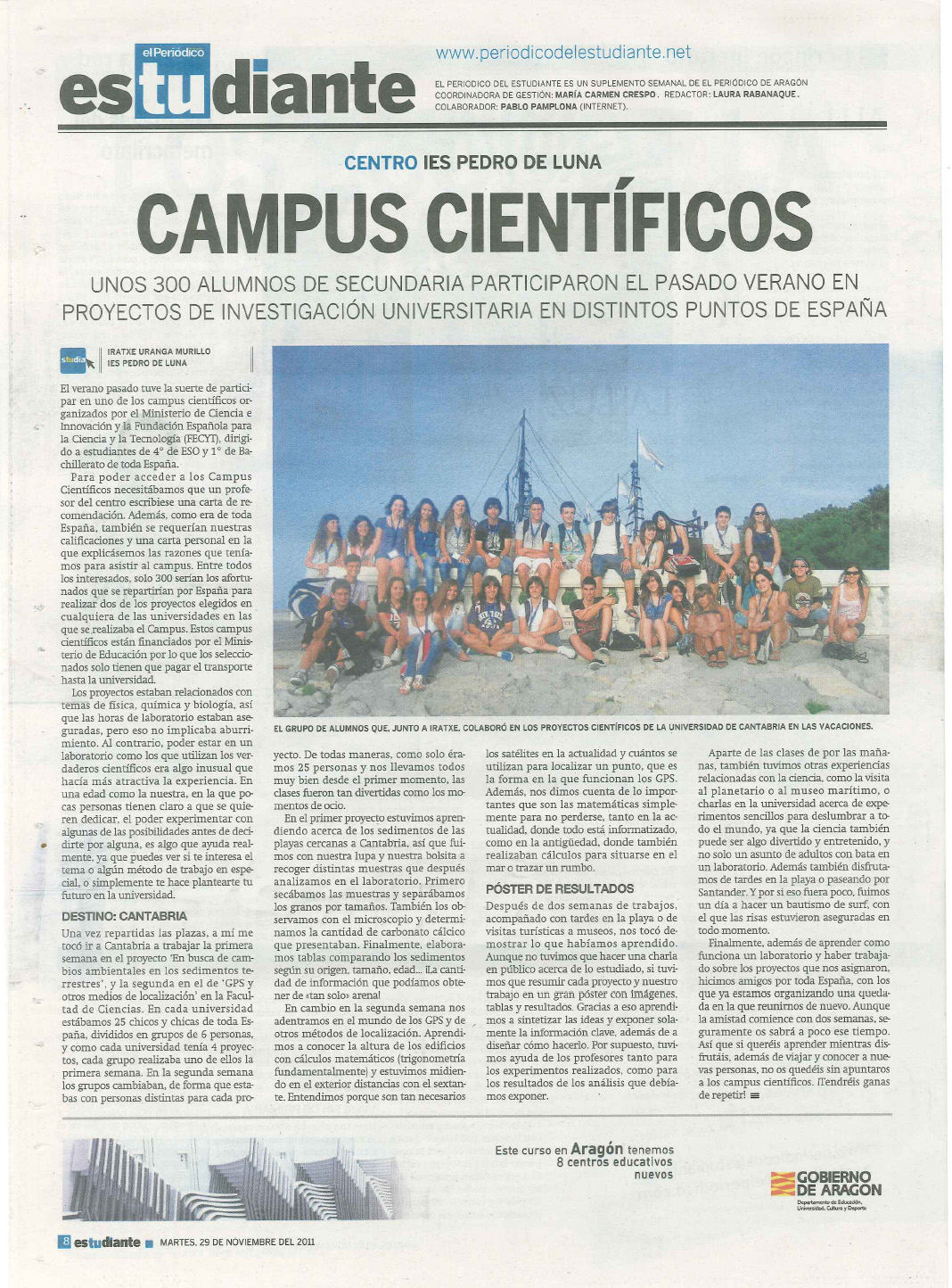 En el número 504 del Periódico del Estudiante del Periódico de Aragón, del 29 de noviembre de 2011, aparecen dos artículos de alumnos del IES Pedro de Luna: en el primero de ellos la alumna Irache Uranga de 2 de bachillerato de ciencias y tecnología ha escrito un artículo sobre su participación en un Campus Científico de verano. En el segundo, varios alumnos de 1º de bachillerato describen la visita del grupo “Violadores del Verso”, en el curso pasado cuando ellos cursaban 4º de ESO, y las actividades que realizaron.
