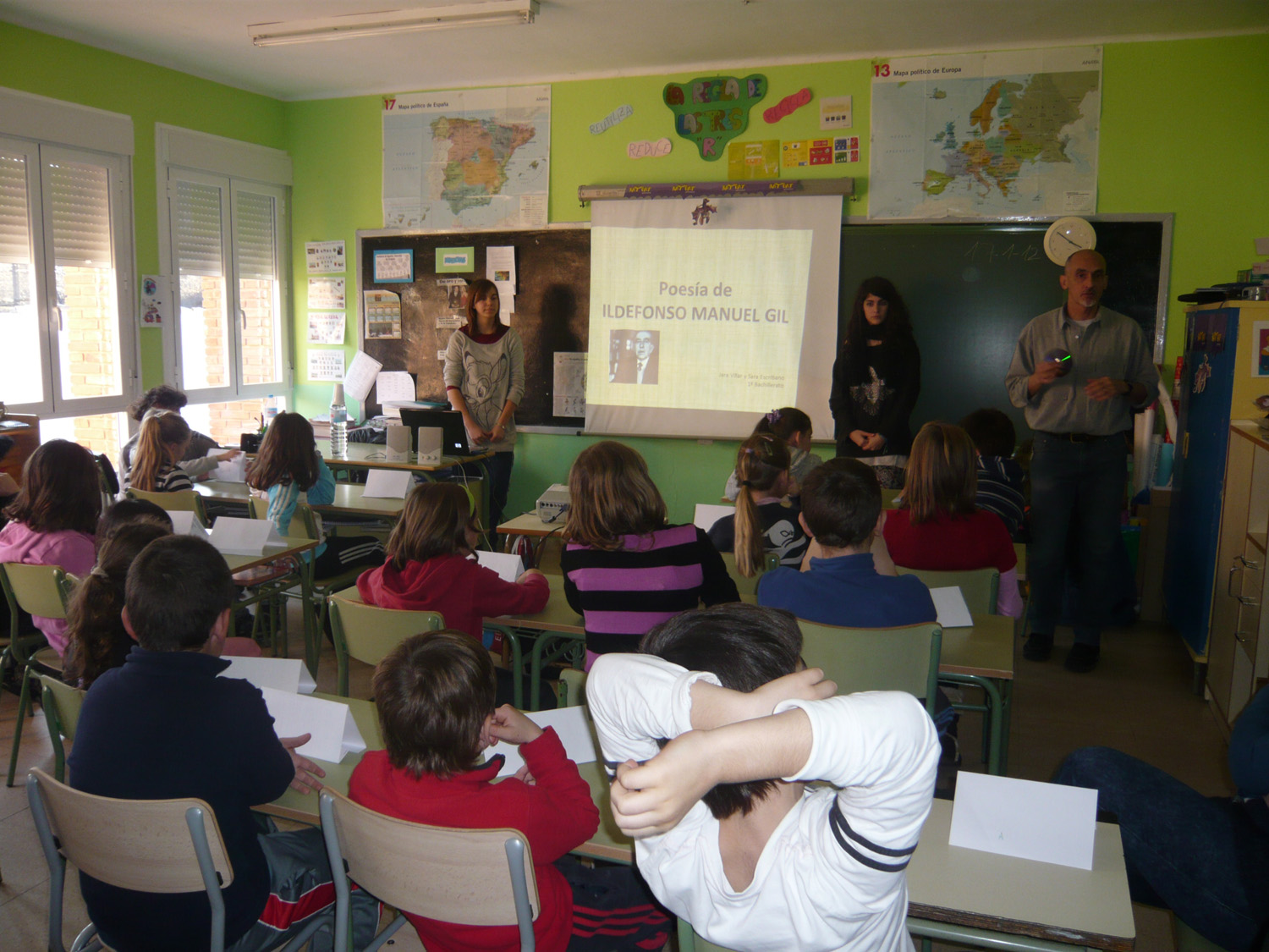 Actos de homenaje por el centenario del nacimiento de Ildefonso-Manuel Gil en Paniza. Las alumnas Sara Escribano y Jara Villar han acudido al colegio público de Paniza a mostrar su trabajo sobre poesía paisajística a los alumnos paisanos del escritor aragonés. Las alumnas habían trabajado, junto a su grupo de 1º de Bachillerato de Ciencias, diferentes textos del autor en los diferentes géneros: poesía, narrativa y teatro. En el colegio de Paniza los alumnos de primaria han estado leyendo también al autor en estos días que se celebra el centenario de su nacimiento. Después de realizar una presentación sobre la poesía del escritor los niños y niñas de Paniza han compartido con las alumnas y su profesor algunas dudas sobre la vida del autor y también su gusto por la poesía y la lectura. Finalmente han mostrado su pericia en el canto pues con la maestra de música han adaptado en forma de canción dos poemas dedicados a Paniza.