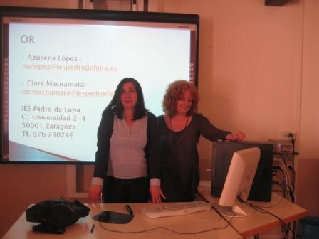 El viernes 4 de mayo, las profesoras del departamento de inglés del IES Pedro de Luna Azucena López y Clare Macnamara dieron una charla en el Centro de Profesores y Recursos “Juan de Lanuza” sobre la metodología utilizada para preparar los exámenes orales a los que se presentan los alumnos de 4º ESO Bilingüe que optan por Inglés como Segunda Lengua y que van dirigidos a la obtención del IGCSE (International General Certificate of Secondary Education). Así, los profesores del Seminario autonómico para el Programa Bilingüe pudieron participar de esta experiencia que se desarrolla en el IES Pedro de Luna desde el curso 2007-2008.