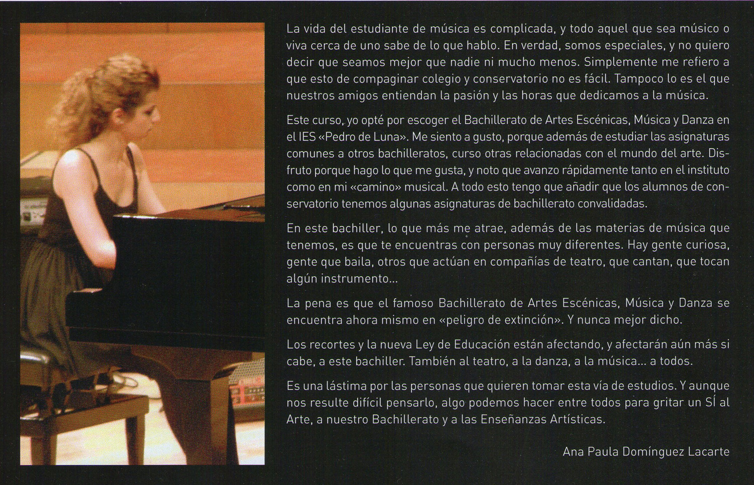 La alumna Ana Paula Domínguez de 1º de bachillerato de Artes Escénicas, Música y Danza ha escrito en el número 41, diciembre de 2012, de “El Calderón” (Boletín informativo de la Asociación de Padres de alumnos del Conservatorio Profesional de Música de Zaragoza) un artículo en el que cuenta a los lectores su pasión, y su esfuerzo (y el de todos los estudiantes que compaginan la formación artística) por la música, su valoración del Bachillerato Artístico, que cursa en el IES Pedro de Luna, y lo interesante y apropiado que es, en su dimensión académica y humana, para los jóvenes que, como ella, quieren compaginar los estudios de bachillerato con sus estudios en el Conservatorio, y la formación en la danza y el teatro.