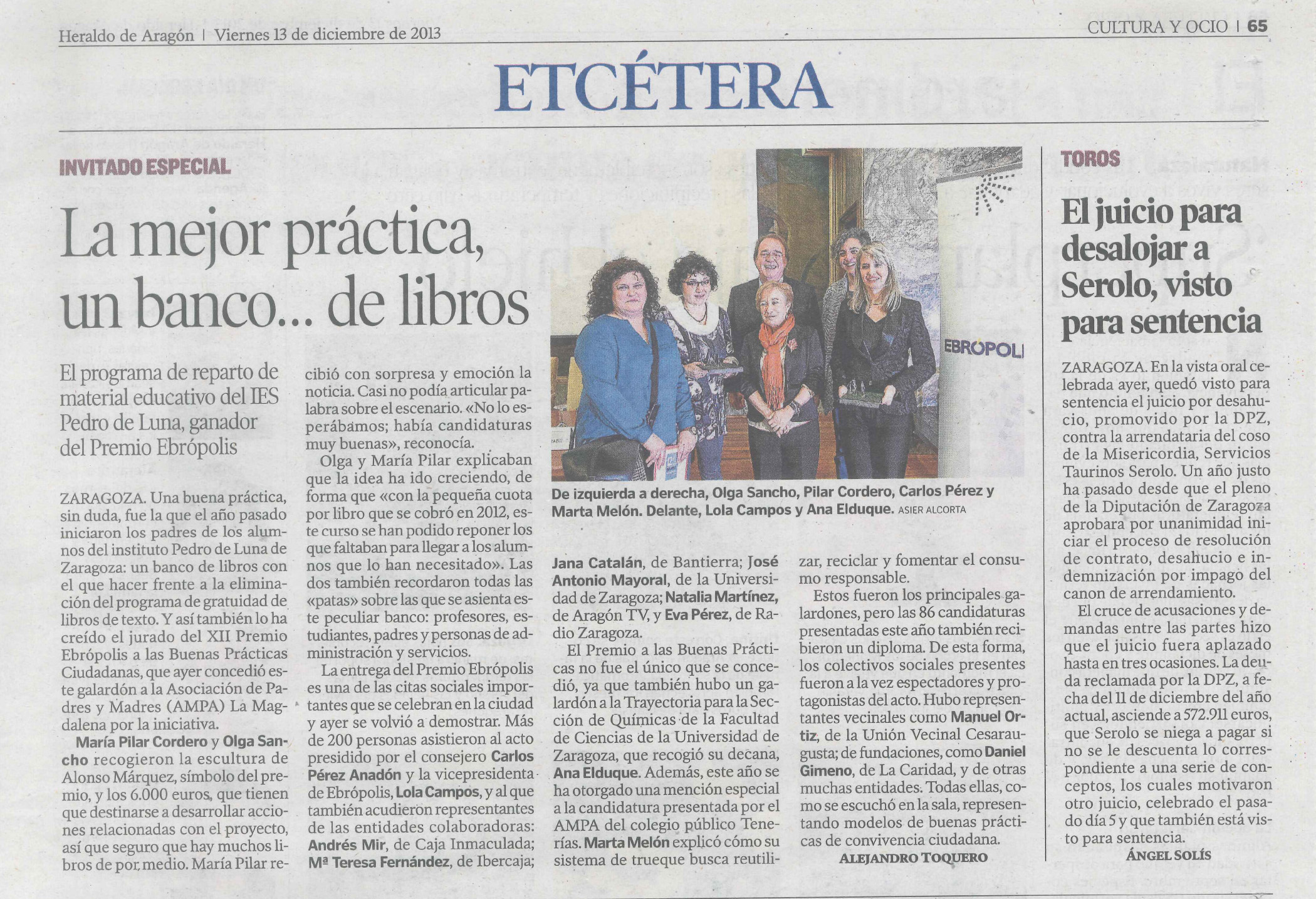 El IES Pedro de Luna en la prensa aragonesa: Premio EBRÓPOLIS 2013 al AMPA del IES Pedro de Luna”