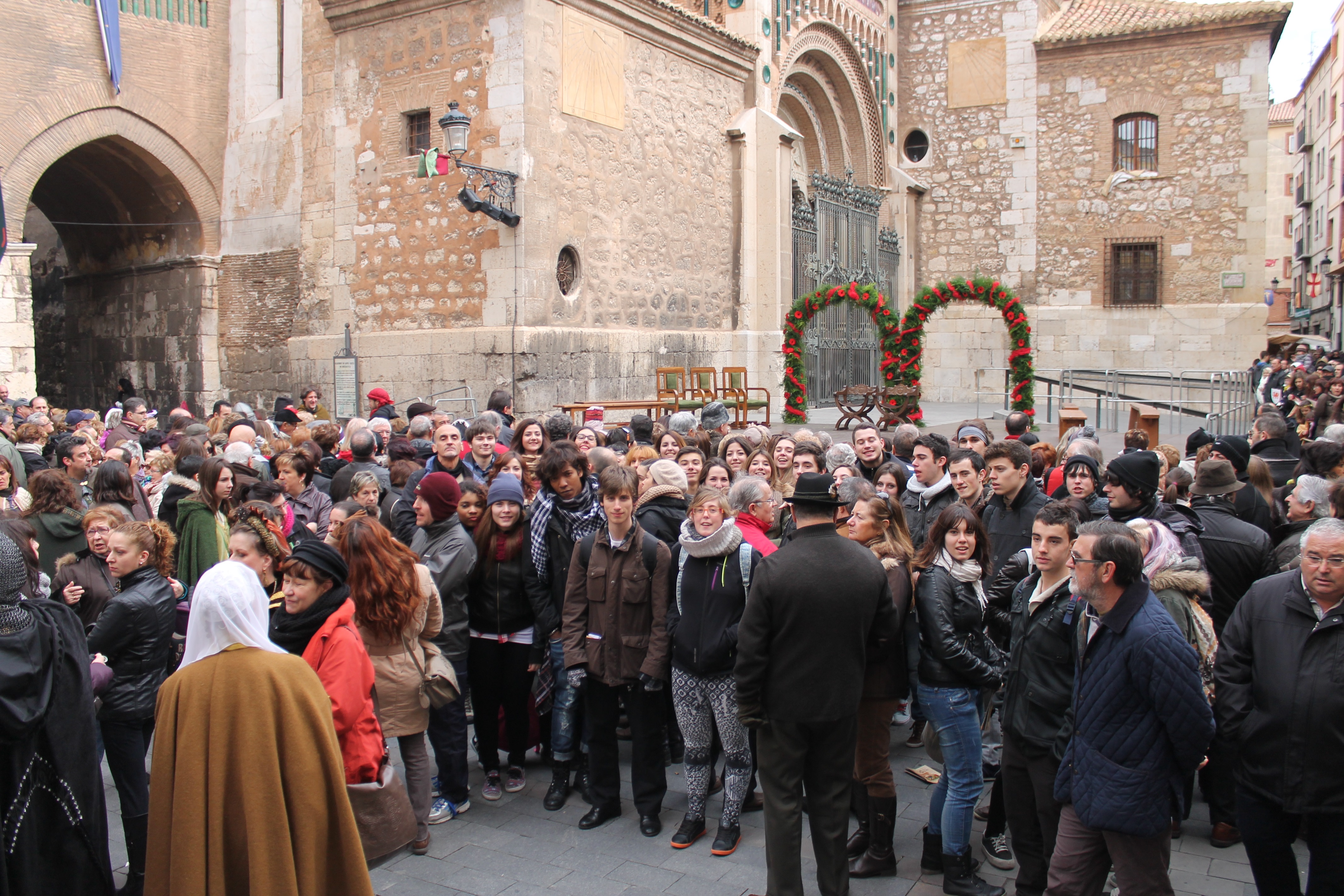 Tal y como estaba previsto, estudiantes de 2º de Bachillerato de Artes Escénicas asistieron en Teruel a la segunda jornada de la celebración de “Las Bodas de Isabel“, en su XVIII edición. En cuanto que llegamos a Teruel nos trasladamos a la Plaza de la Catedral, donde nos esperaba la directora artística Marián Pueo, que había estado con nosotros en clase unos días antes. Ella es una de las tres personas que ha dirigido los espectáculos teatrales. Nos presentó a la novia, antes justo de que saliera a la escena de la Comitiva Nupcial y a la boda con don Pedro de Azagra. La fotografía recoge el momento en que esperamos el grupo para ver esta representación de teatro de calle, que es lo que fundamentalmente nos interesaba en este viaje, además de conocer el éxito de esta ambientación medieval, sus mercadillos, el reclamo turístico y económico que supone, y la vida y el festejo en que participan los turolenses en las haymas. Pudimos disfrutar también de otras actuaciones a lo largo de la jornada, para acabar con un concierto de música folk celta que se alargó un poco más de lo previsto.